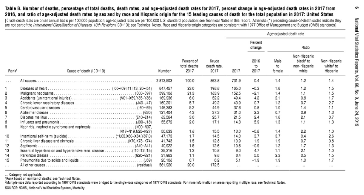 that, another way to die. CDC Death Statistics for 2017 Deaths: Leading Causes for 2017.pdf https://www.cdc.gov/nchs/data/nvsr/nvsr68/nvsr68_06-508.pdf Rankings for 2018 were the same as in 2017. Access data table for Figure 2 in.pdf https://www.cdc.gov/nchs/data/databriefs/db355_tables-508.pdf#page=2 |